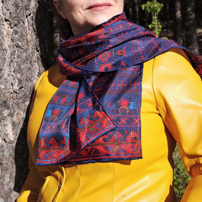 Цветове: Доминира червеният цвят (символ на кръвта и живота), следван от черното, зеленото и синьото.